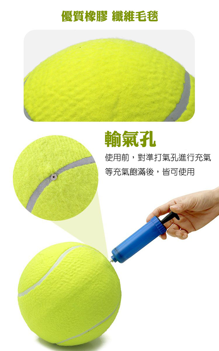 ※由於出貨時安檢規範較為嚴格,大網球無法在充氣後進行出貨,因此所有已寄出的商品皆為未充氣狀態。