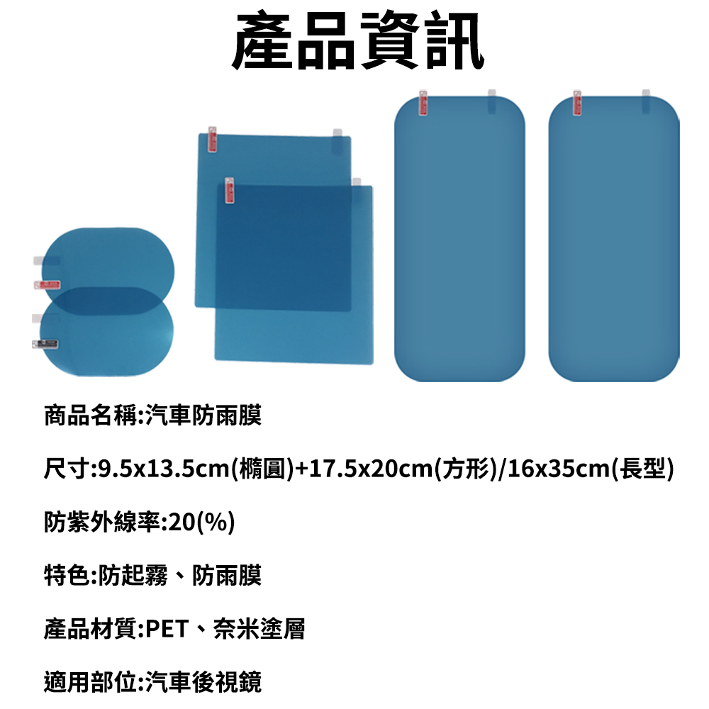 (16x35cm)防雨膜*1對+貼紙*1+擦拭布*1+小刮板*1+大刮板*1+酒精棉片*1
