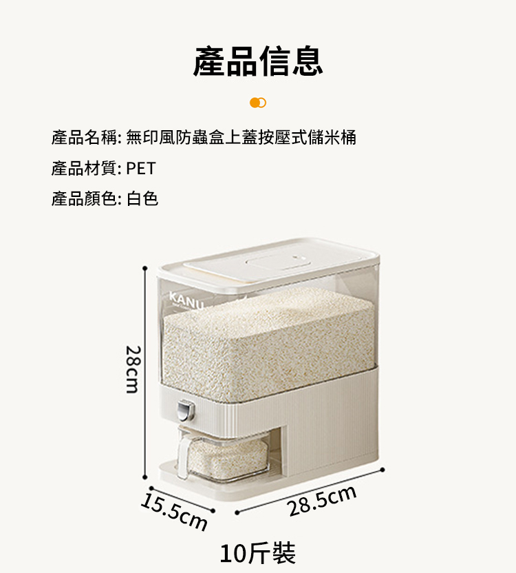規格:10斤裝顏色:白色材質:PET尺寸:15.5*28.5*28cm重量:1.6kg產地:中國包裝內容物:主體*1+上蓋配件*3+出米盒*1+出米盒上蓋*1+止滑貼*4+外箱*1※因顯示差異及拍攝光線,照片與實品可能會存在輕微色差※因平舖直量測量方法不同,1-2cm 誤差屬正常範圍※退貨請維持外包裝及內容物的完整性,以免造成退貨的權益