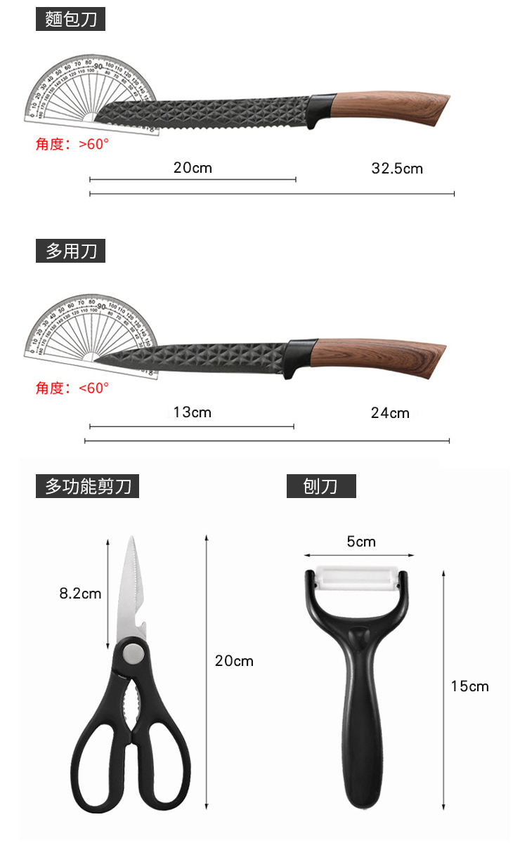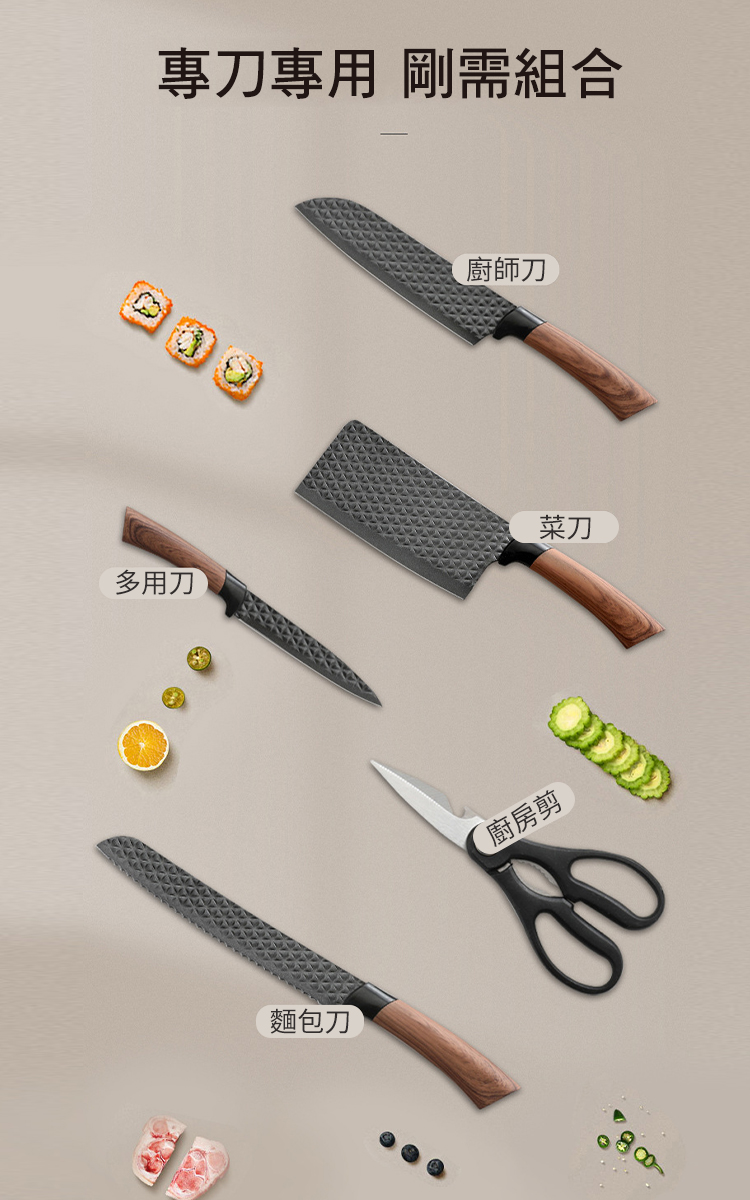 內容物(單):外盒x1、菜刀x1、廚師刀x1、麵包刀x1、多用刀x1、多功能剪刀x1、刨刀x1